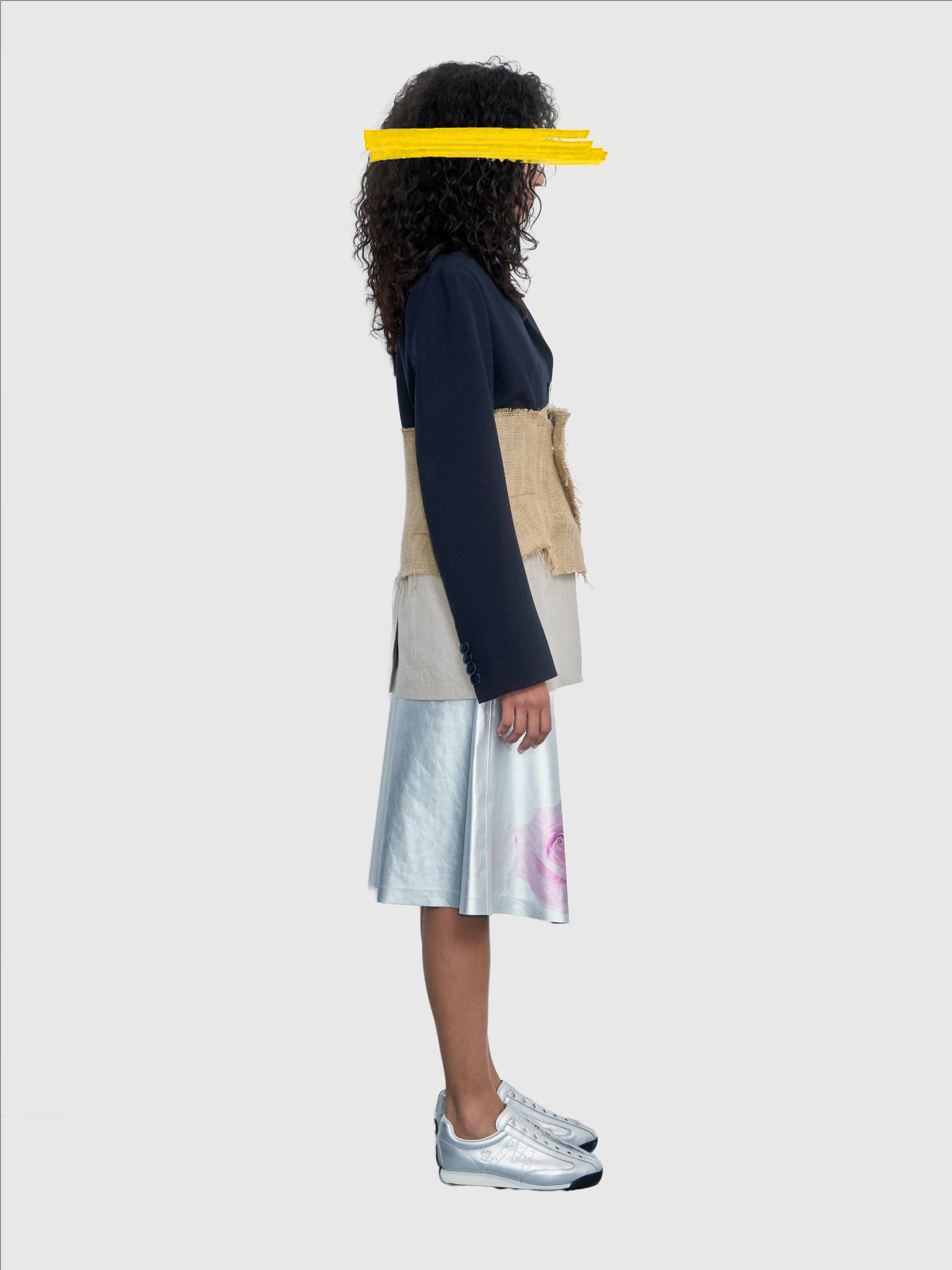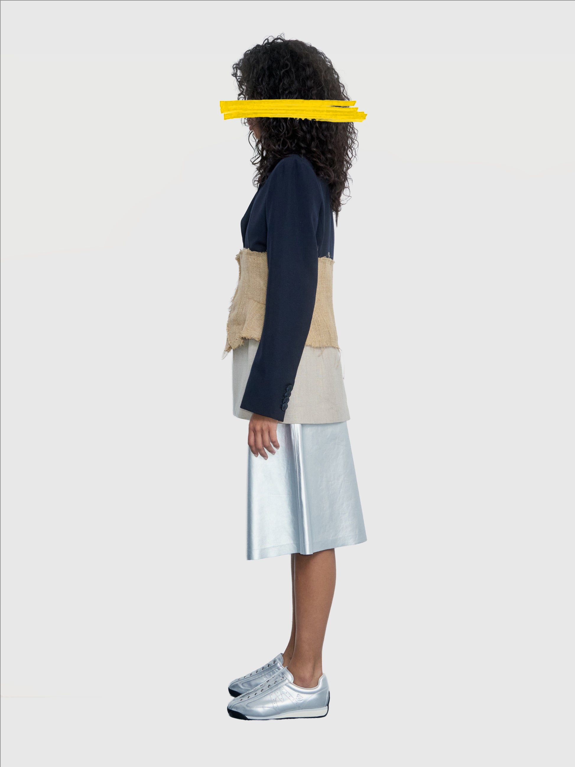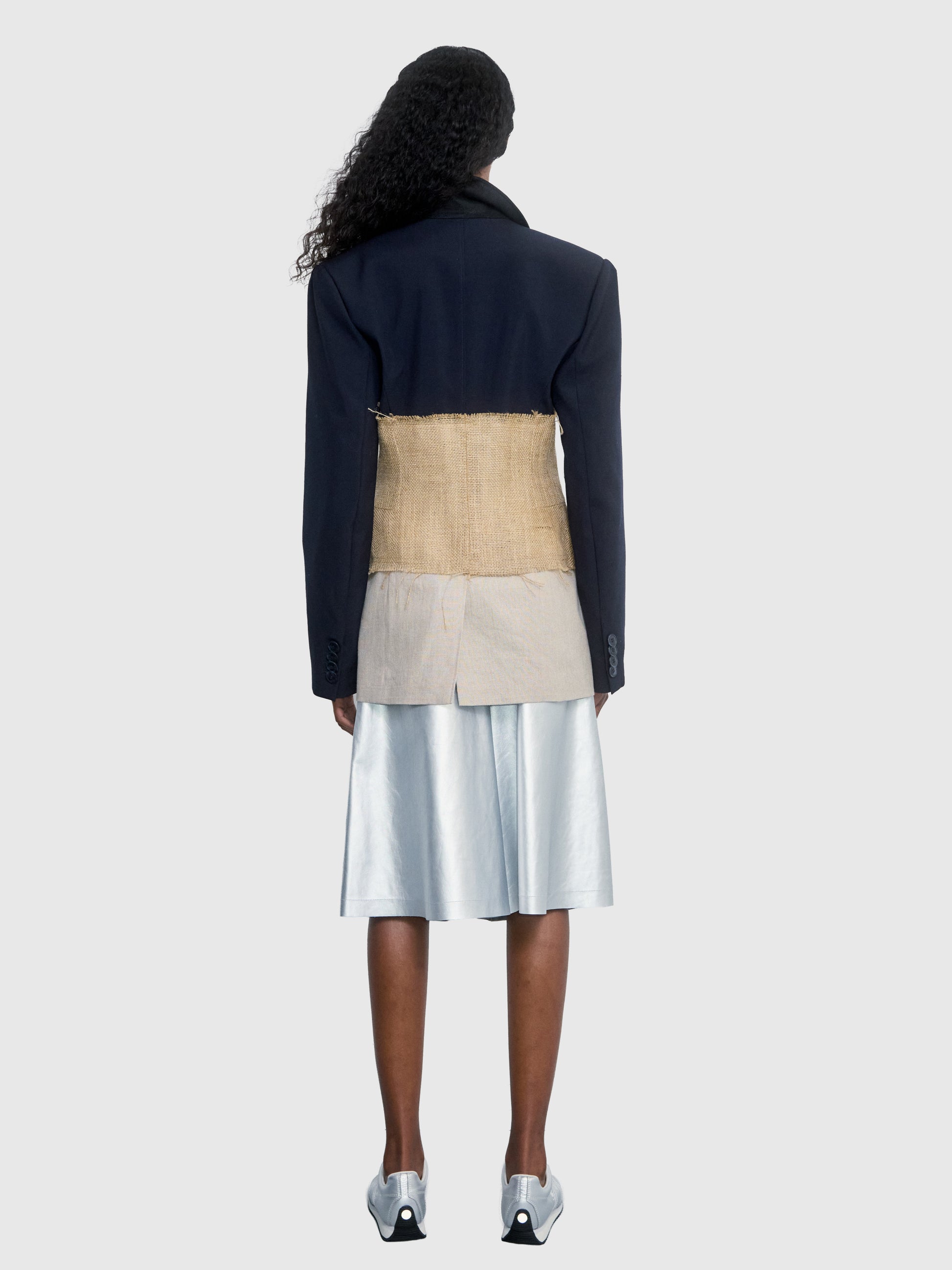 Tailored jacket made from three different fabrics: navy wool on top, jute in the middle, and beige wool at the bottom