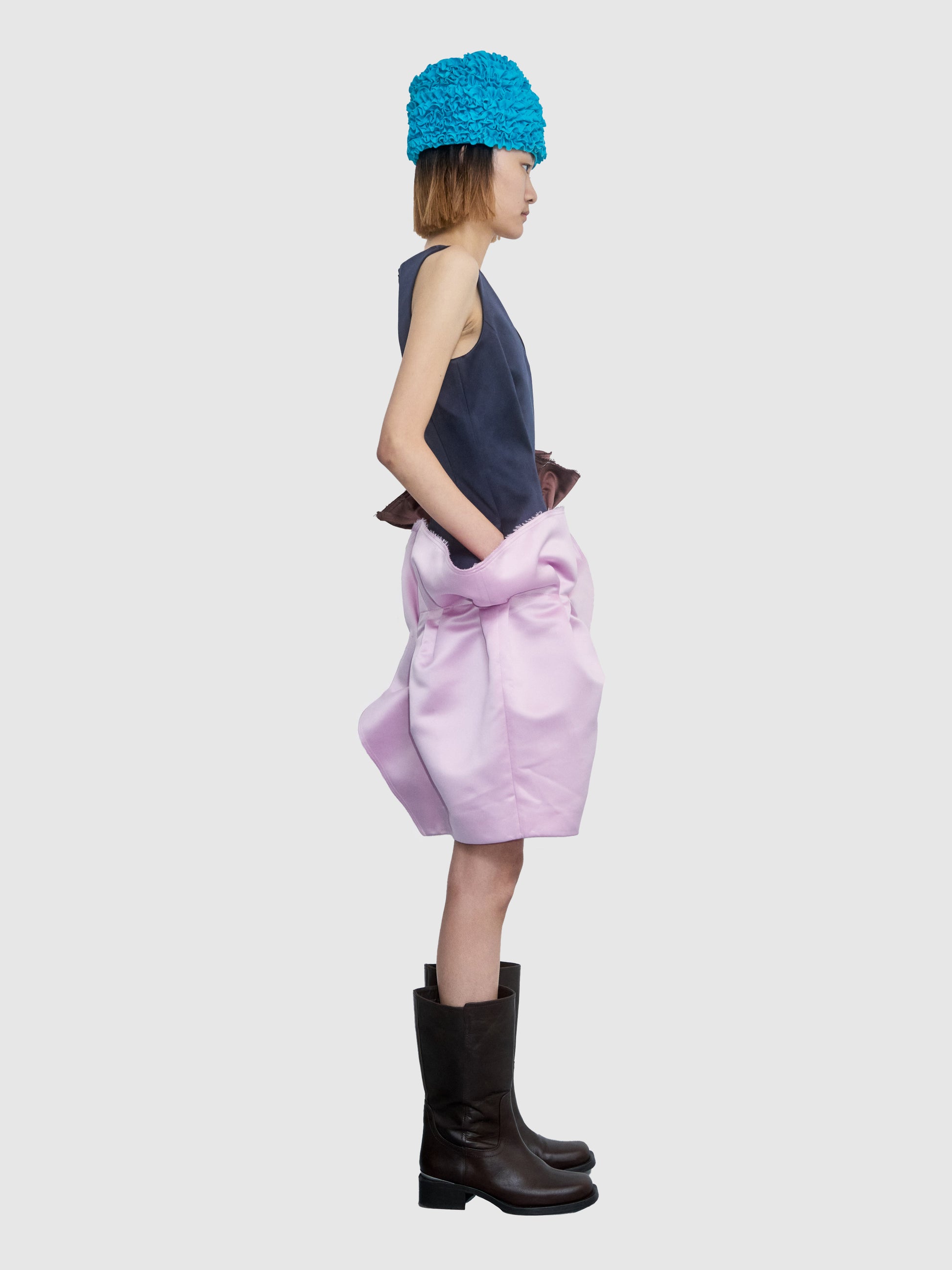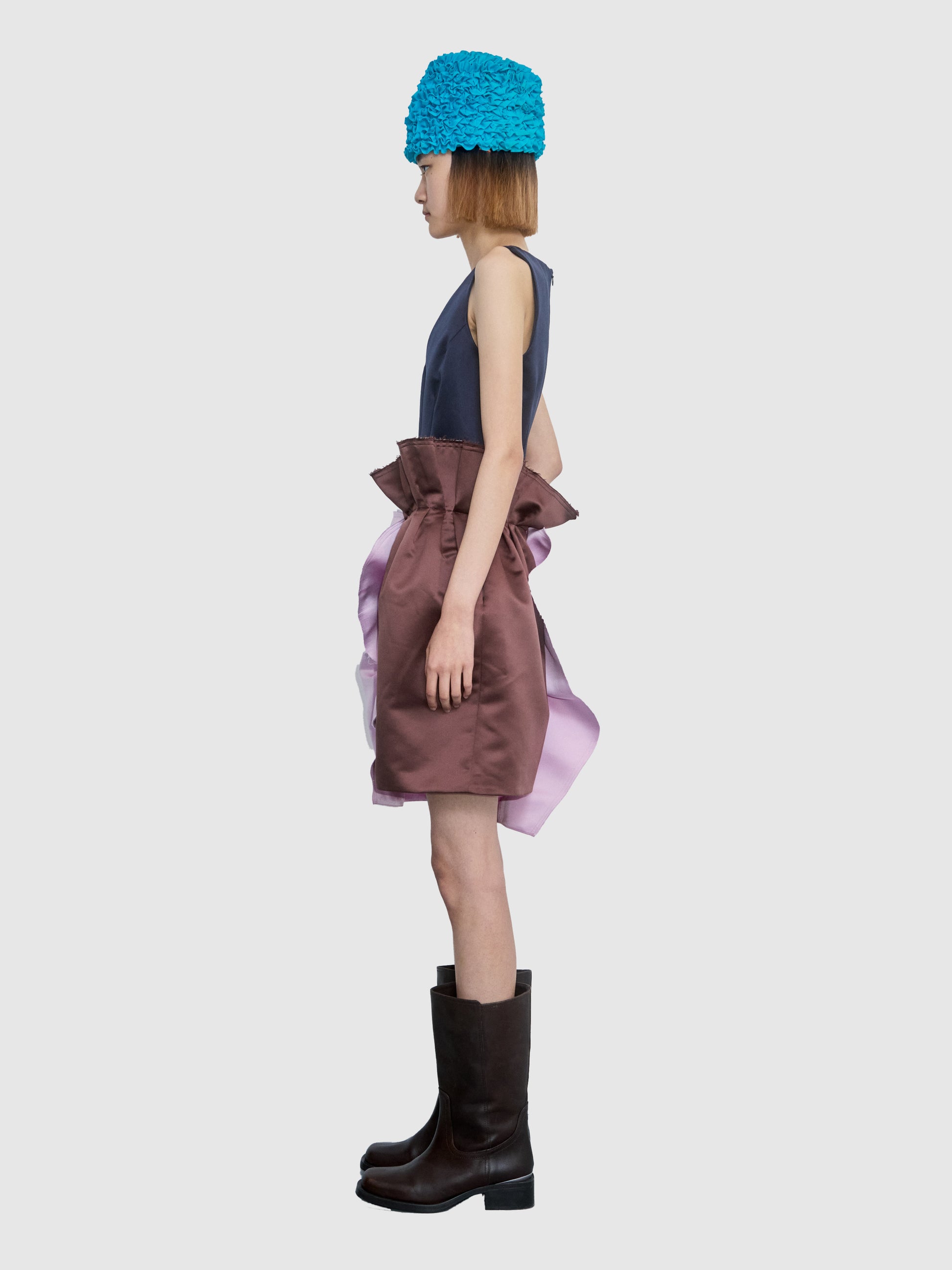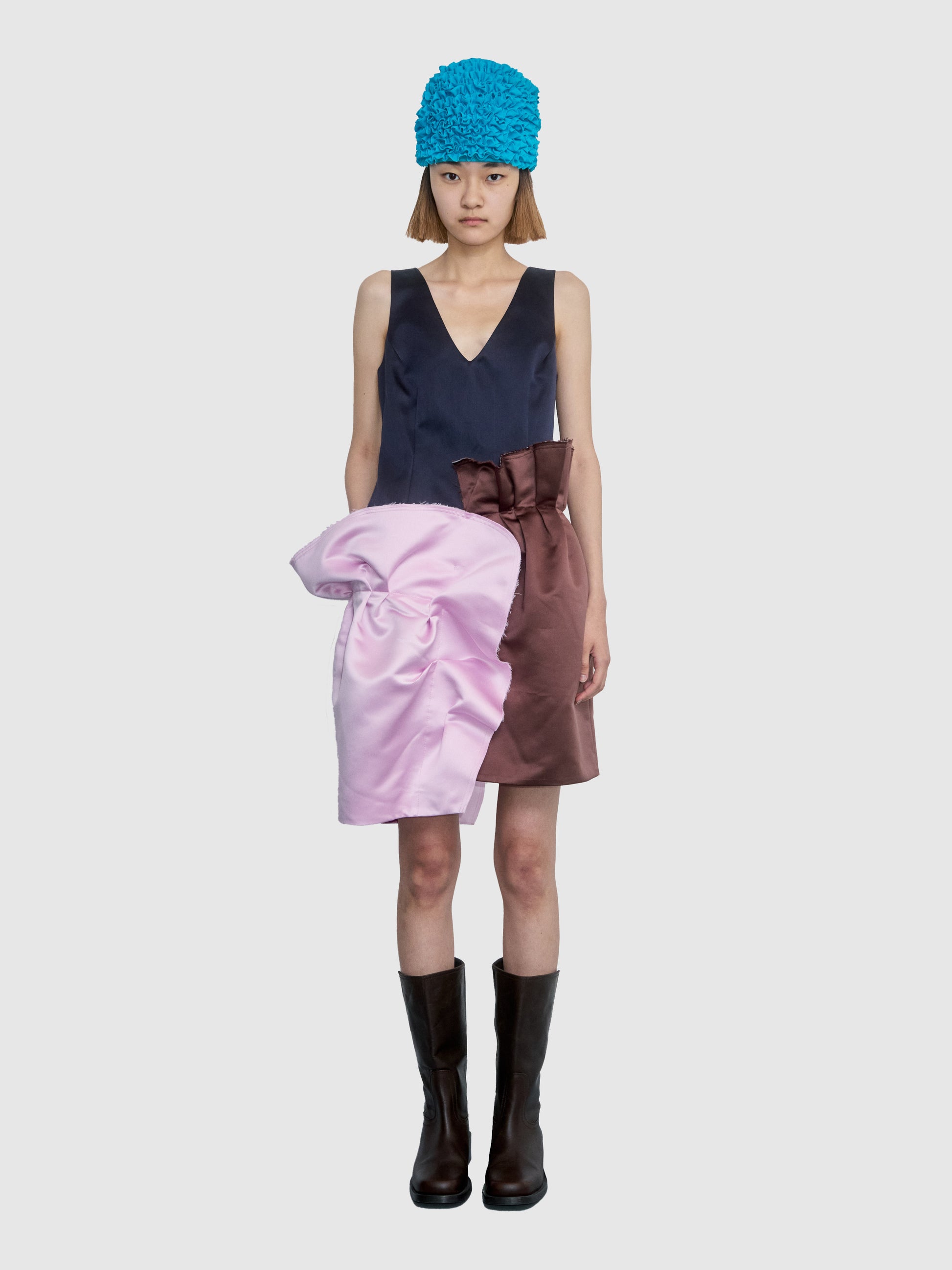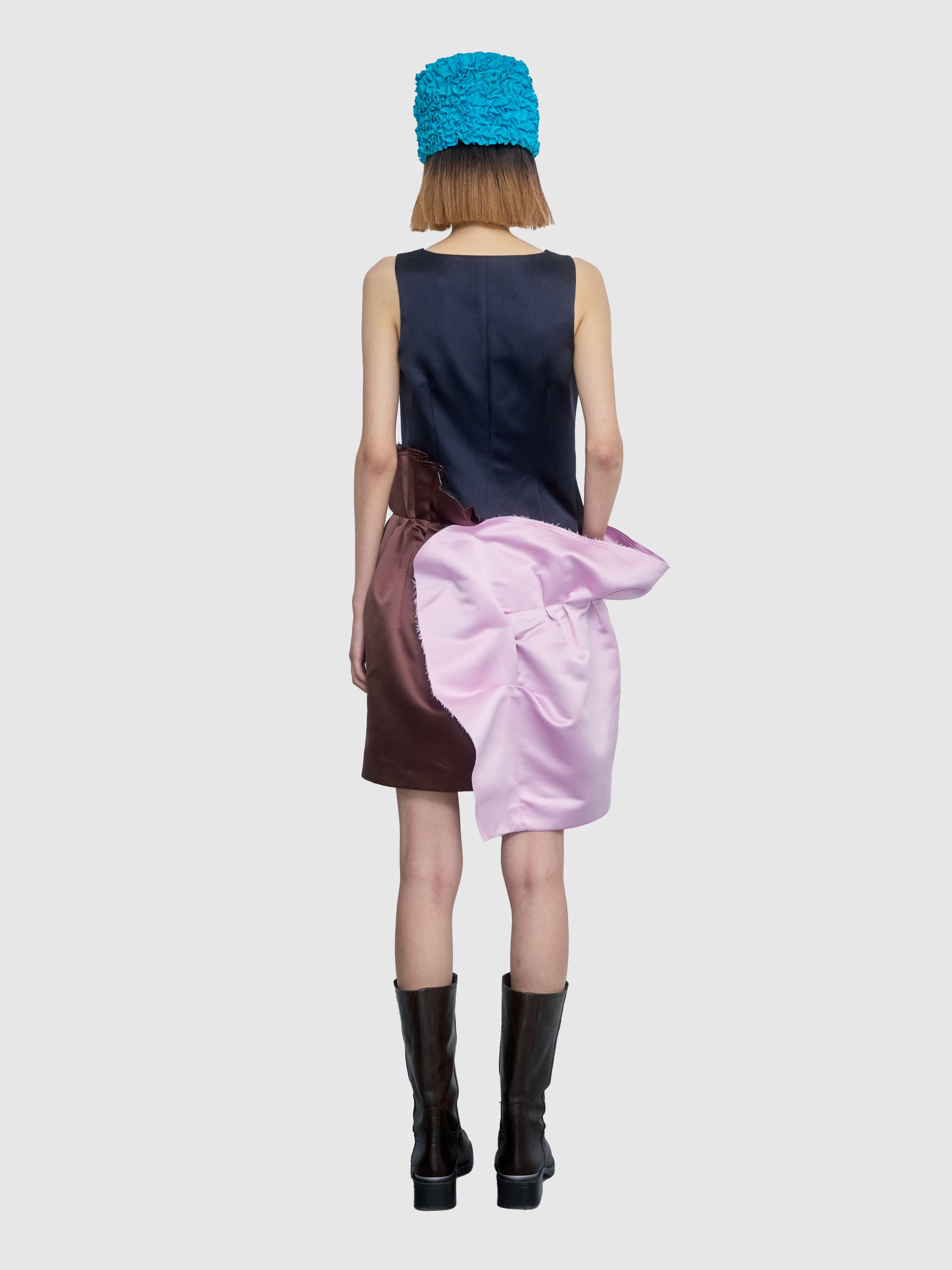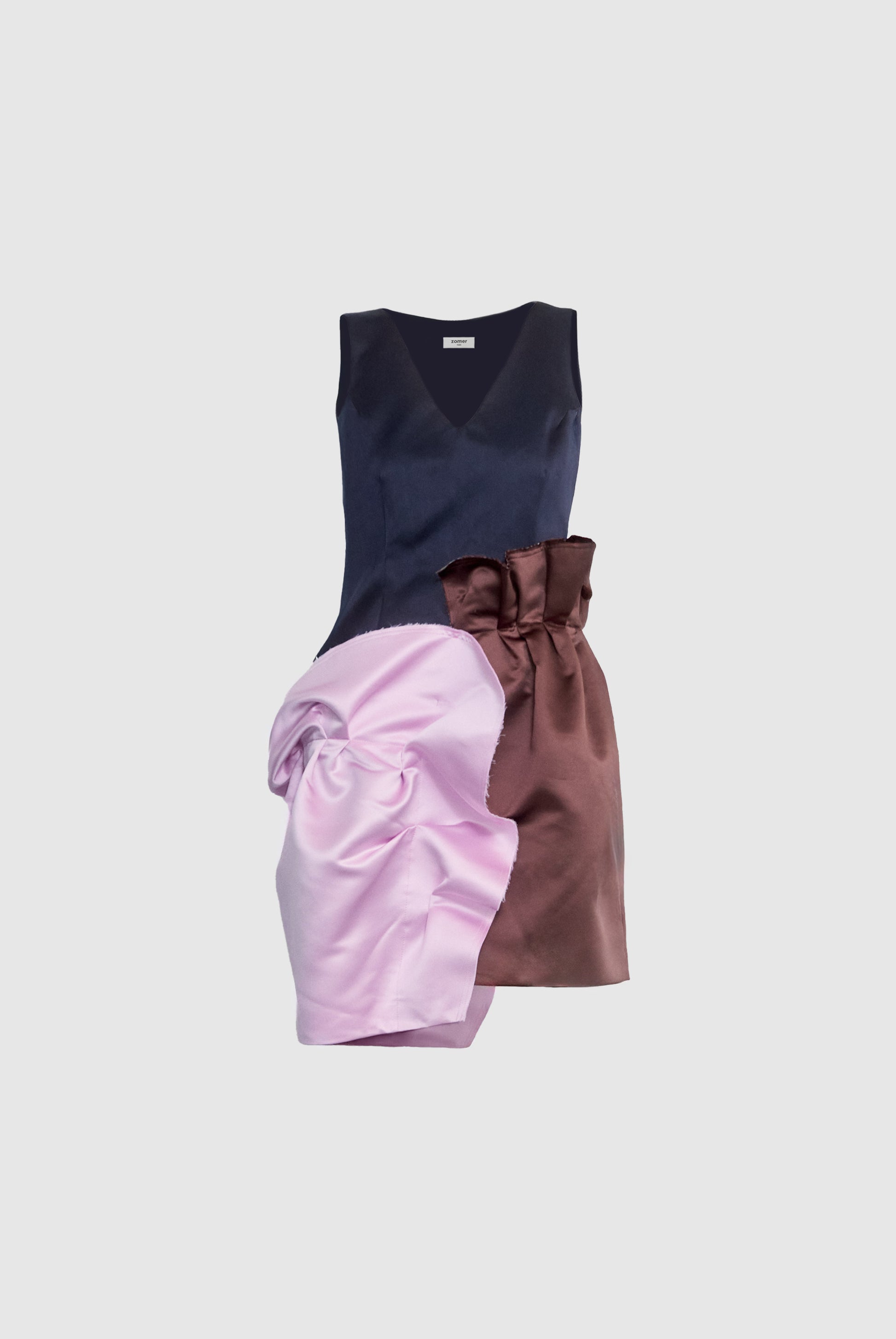 Navy, Brown, And Pink Satin Dress Featuring Various Shapes And Lengths.