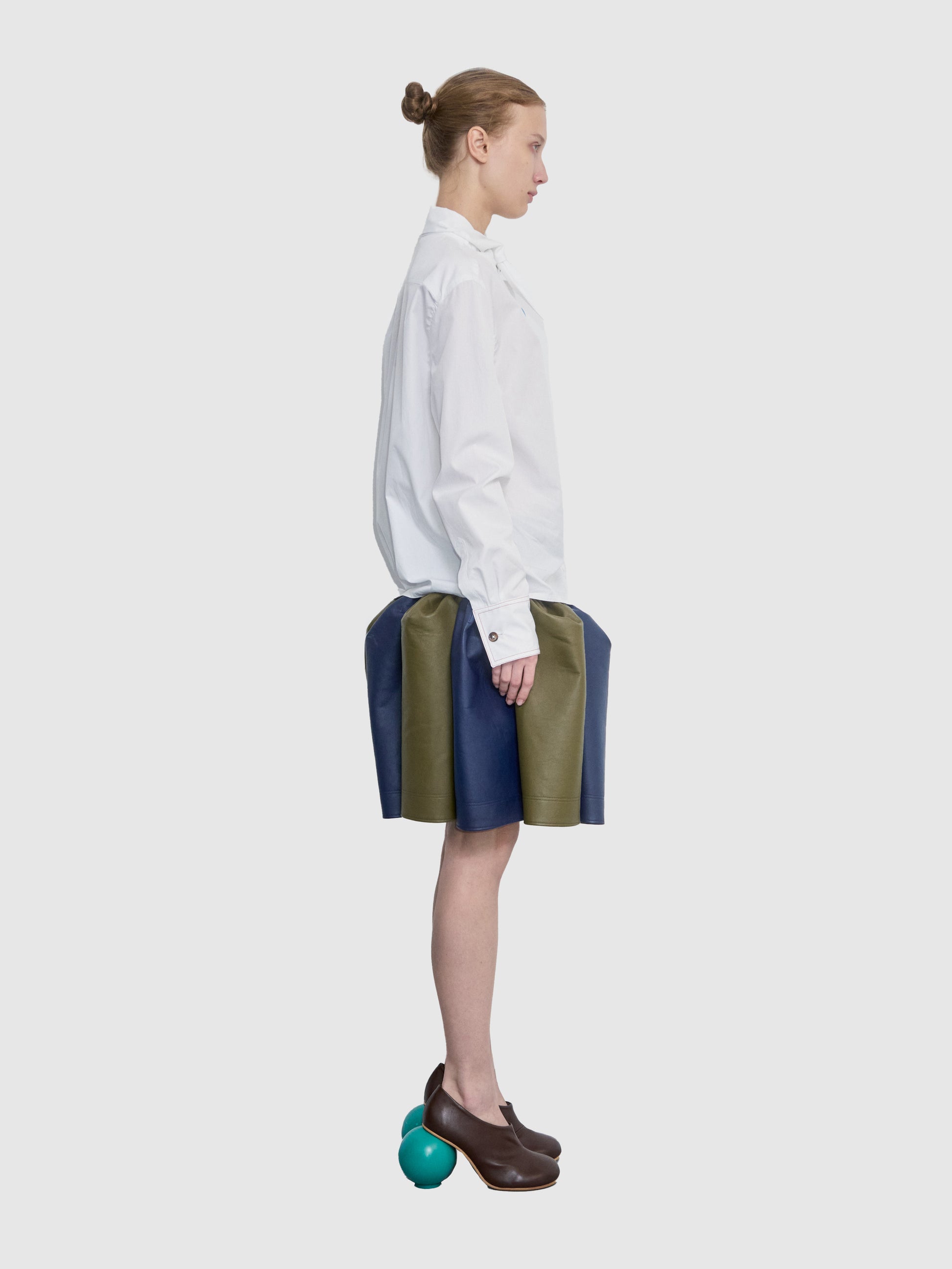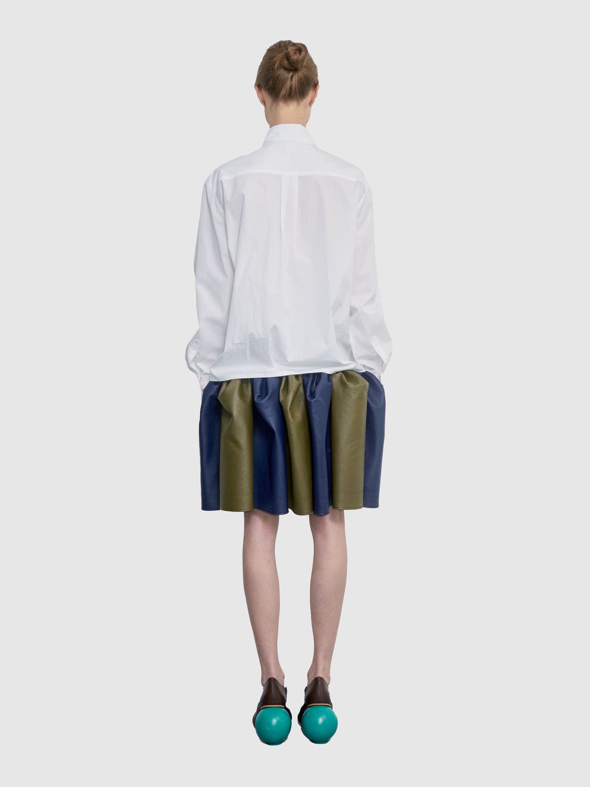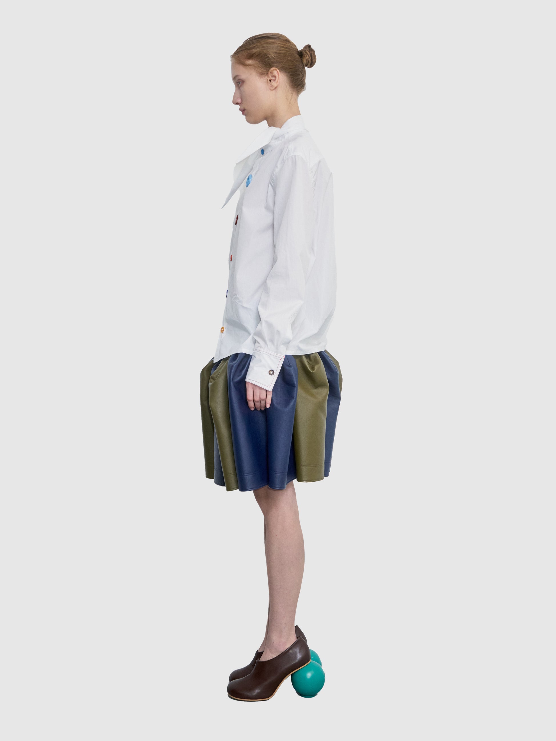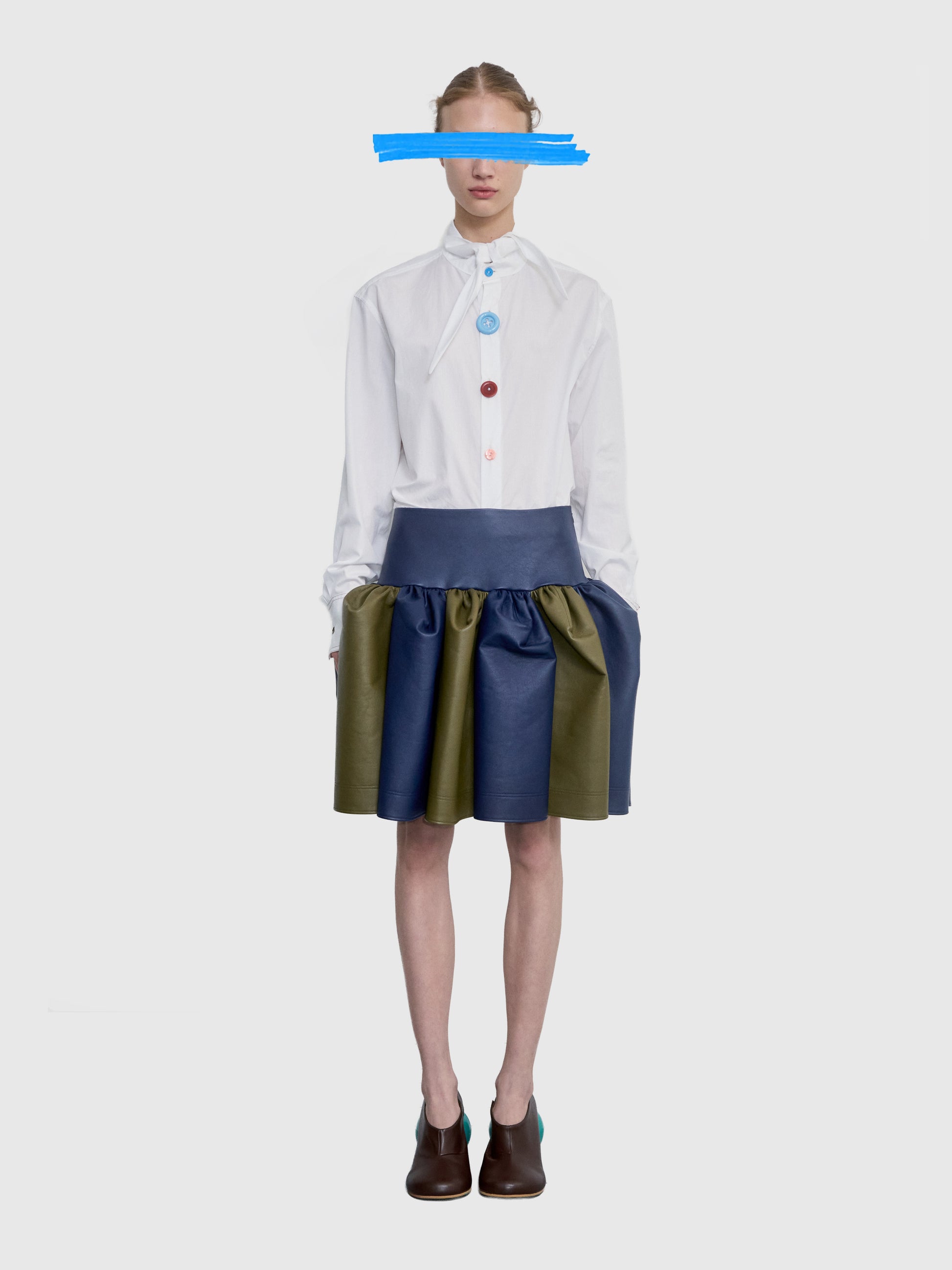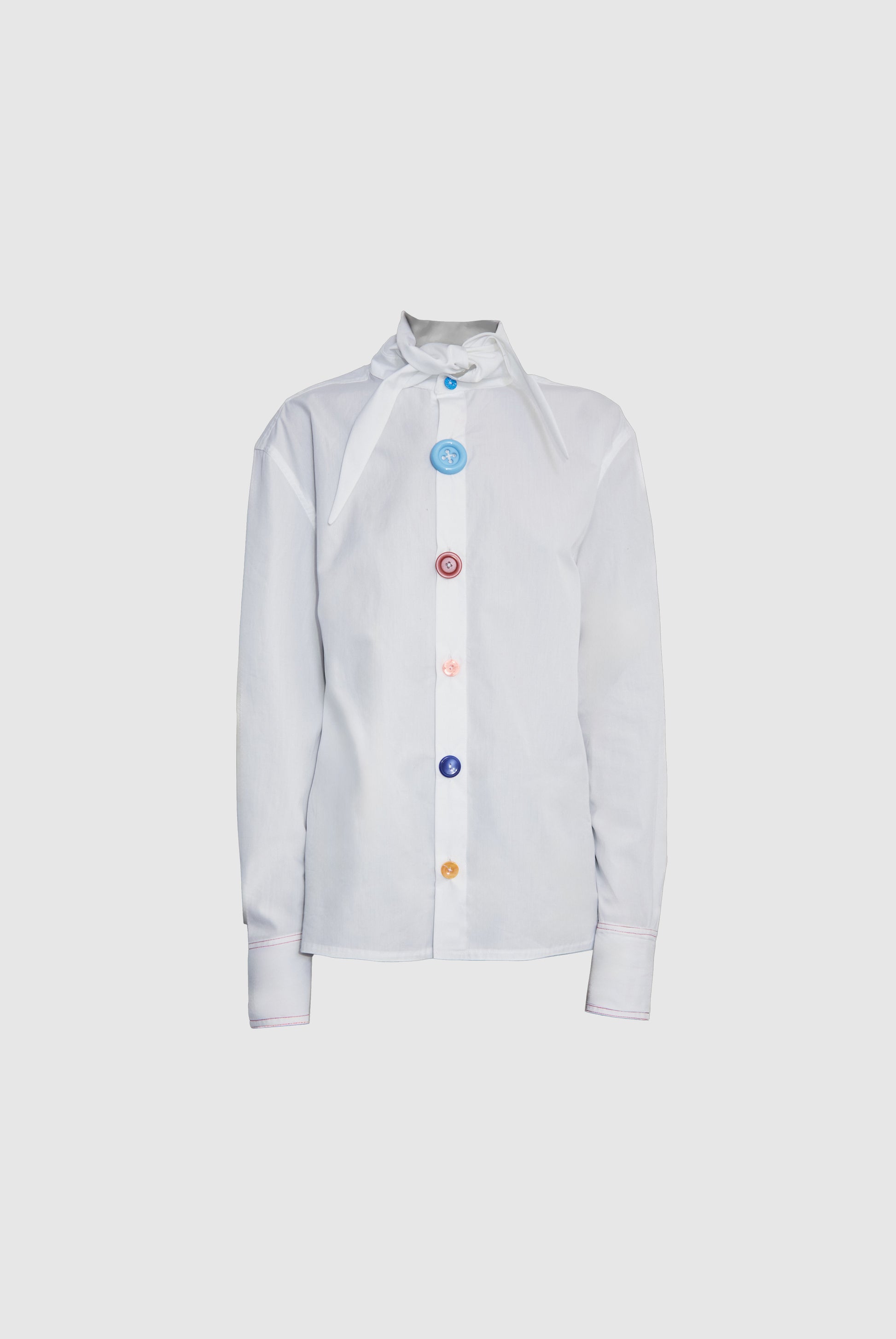 Poplin Shirt Featuring A Scarf Tie Collar And Buttons Of Varying Sizes And Colors.