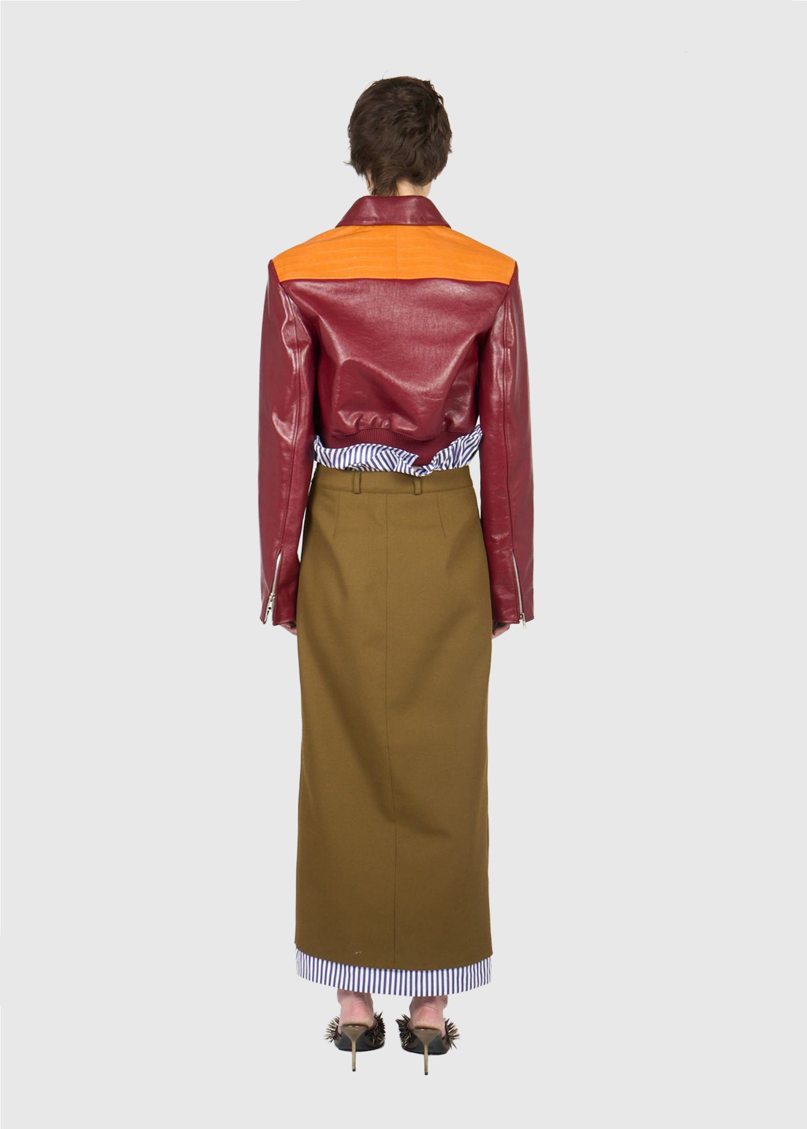 Straight Reversed Skirt With Upside Down Shirt Details on Slit and Hem, featuring a Removable Collar on the Waist